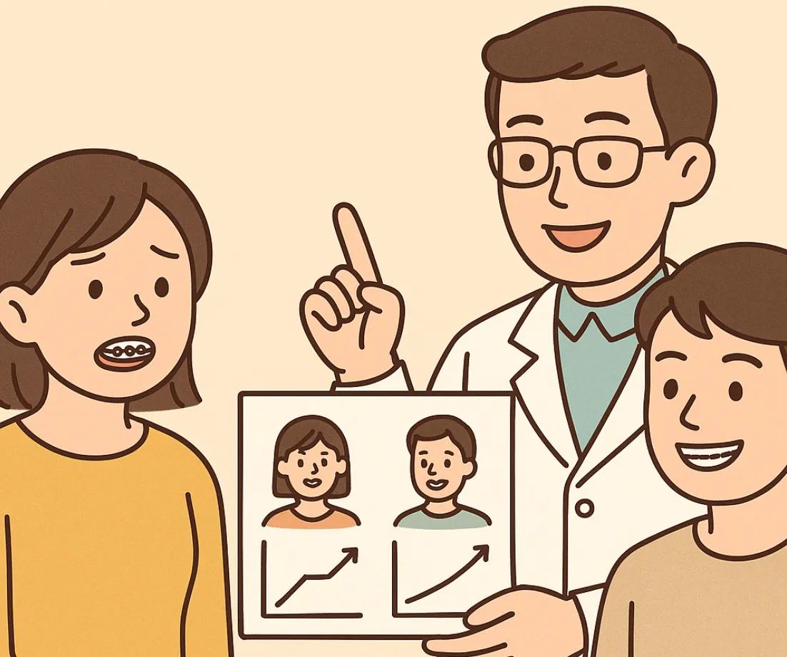 特に成長期(小学校高学年から中学生頃)の子どもの場合、顎の成長をコントロールできるため、骨格的な問題も比較的効率よく改善できることがあります。これを成長誘導と呼びますが、この時期を逃すと、同じ効果を得るためには外科的矯正治療(顎の手術)が必要になることもあります。